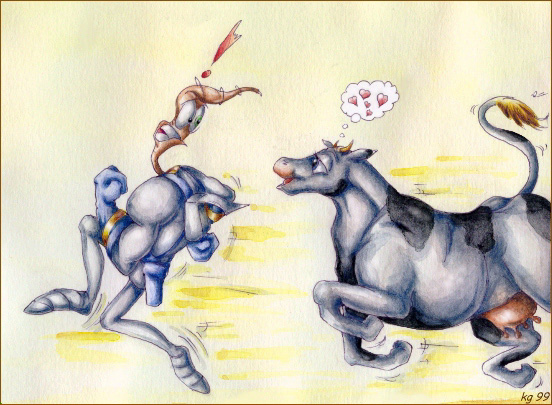 Hey, Lemming sent me some more of her cool artwork this time Jim is being chased by a besotted cow... Supposedly she
